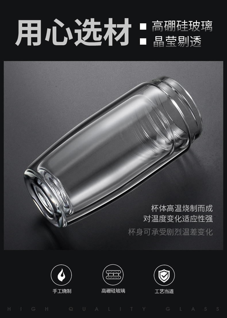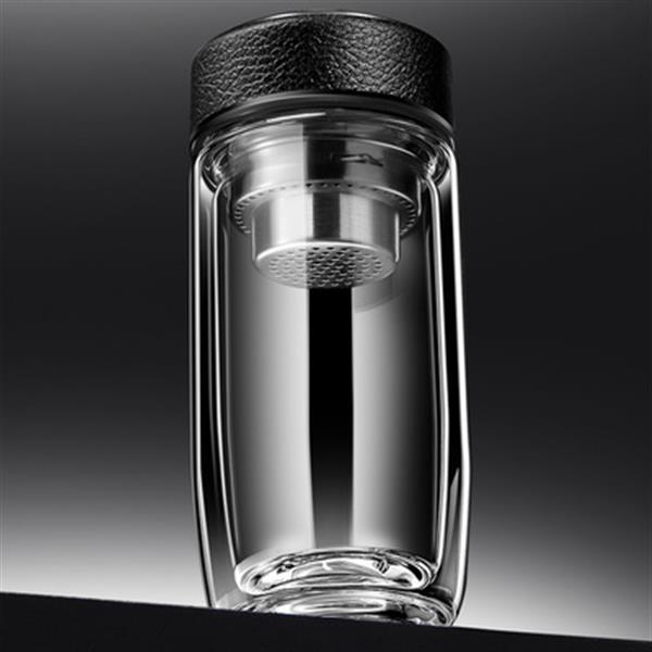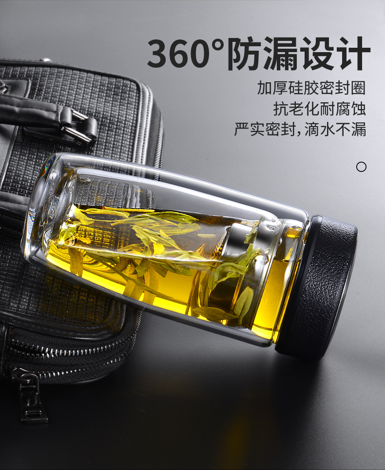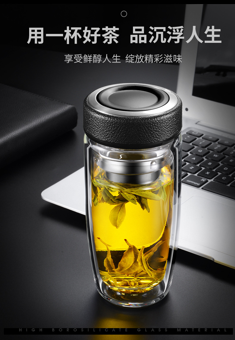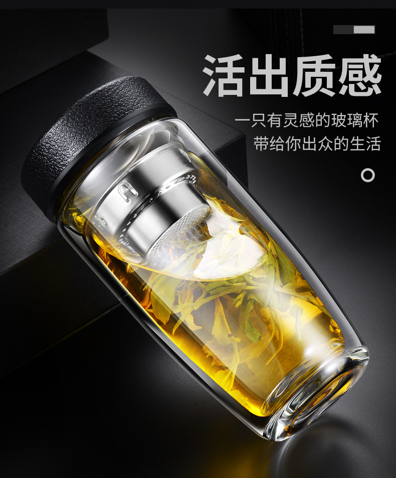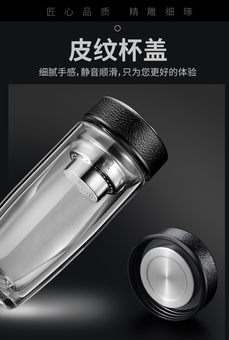 双层耐热高硼硅玻璃杯男女皮纹盖式泡茶水杯礼品