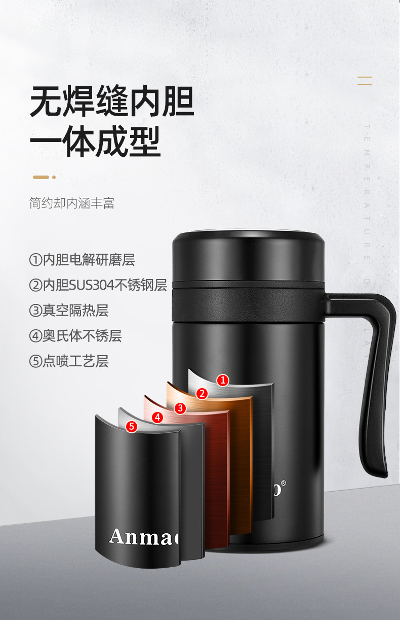 安茂双层304不锈钢保温杯办公带手柄过滤网泡茶杯子